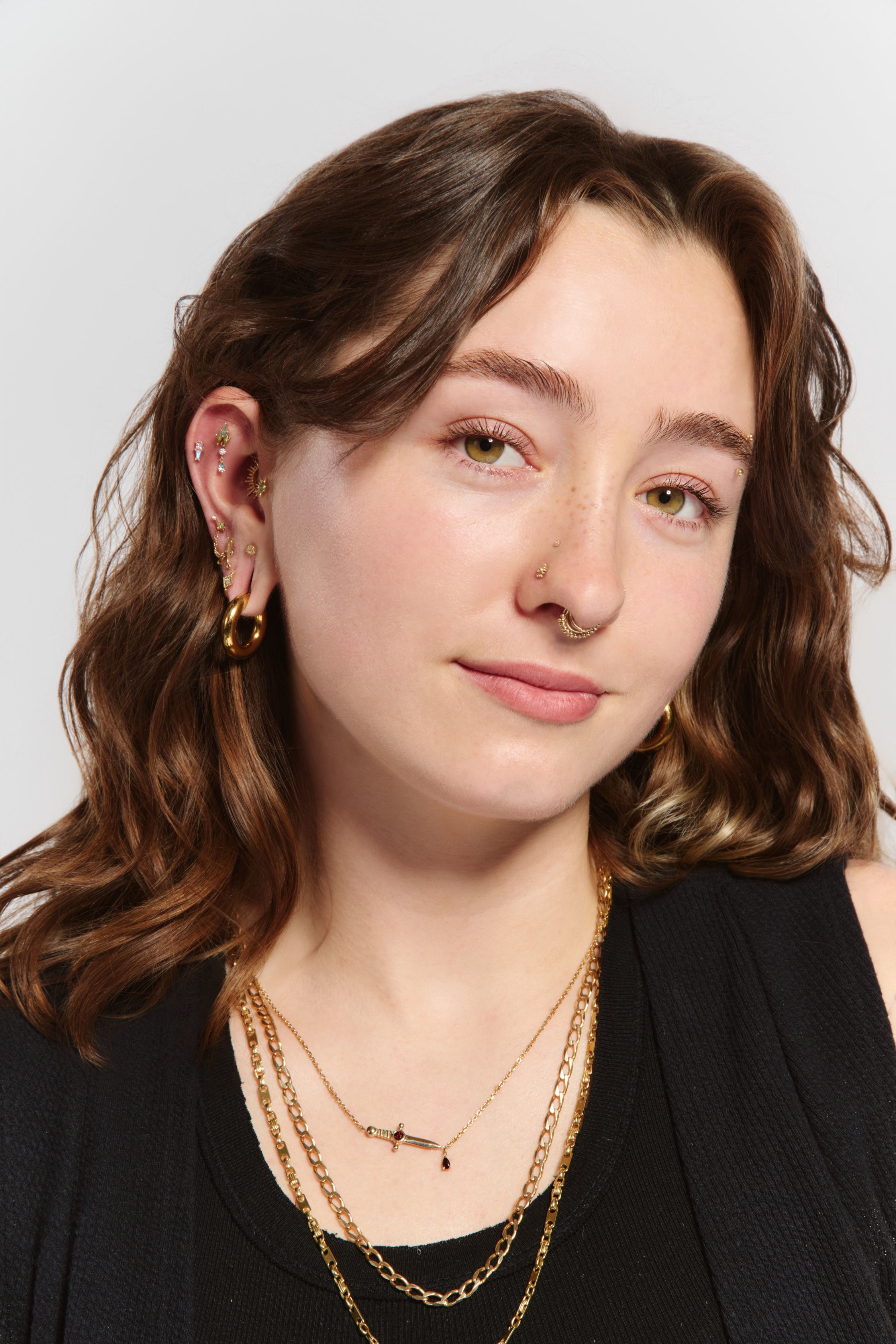 "I've always had a passion for jewelry and piercings. I love how you can express yourself through various pieces and tell a story about your life and style. It's important to me that customers are welcomed into the shop with a big smile and positive energy. Our team works together to create a comfortable environment where clients can feel confident when they are shopping for jewelry for a new piercing, shopping to add to their existing piercing or anything in between. My favorite piece of BVLA jewelry that I am currently wearing is the Peach Topaz Marquise Sarai with Diamonds. It is so elegant but adds a beautiful pop of color simultaneously. I also have to mention my Micro Pave Horseshoe since it's such a fun piece!"
