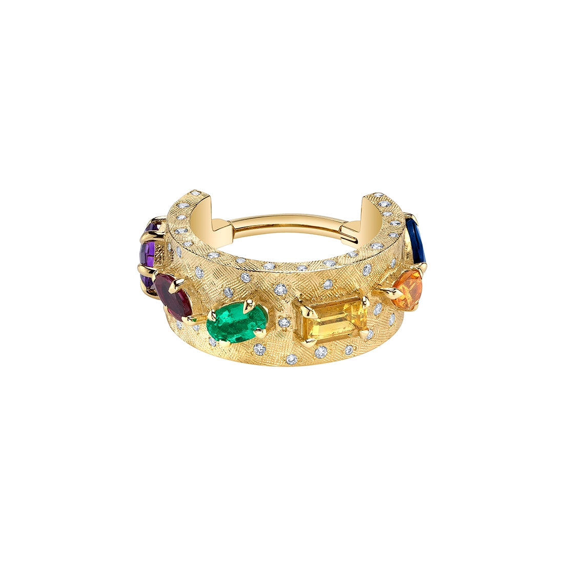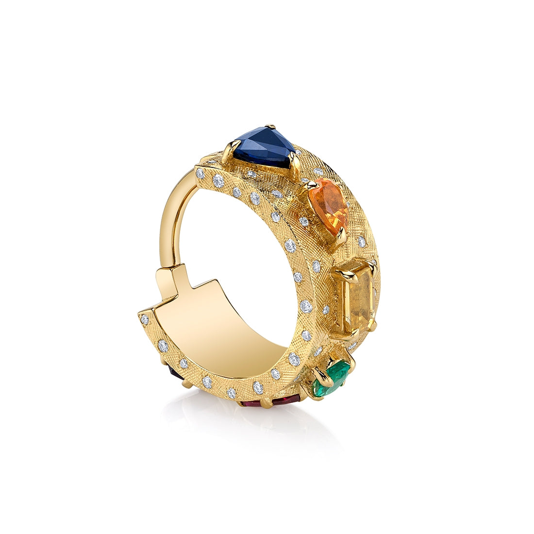 Gemstones | 5mm Sapphire Trillion, 5x3mm Spessartite Pear, 5x3mm Yellow Sapphire Emerald, 5x3mm Emerald Oval, 4x2mm Ruby Marquise, 5mm Amethyst Hexagon, 1mm (35) and .8mm (40) Diamonds